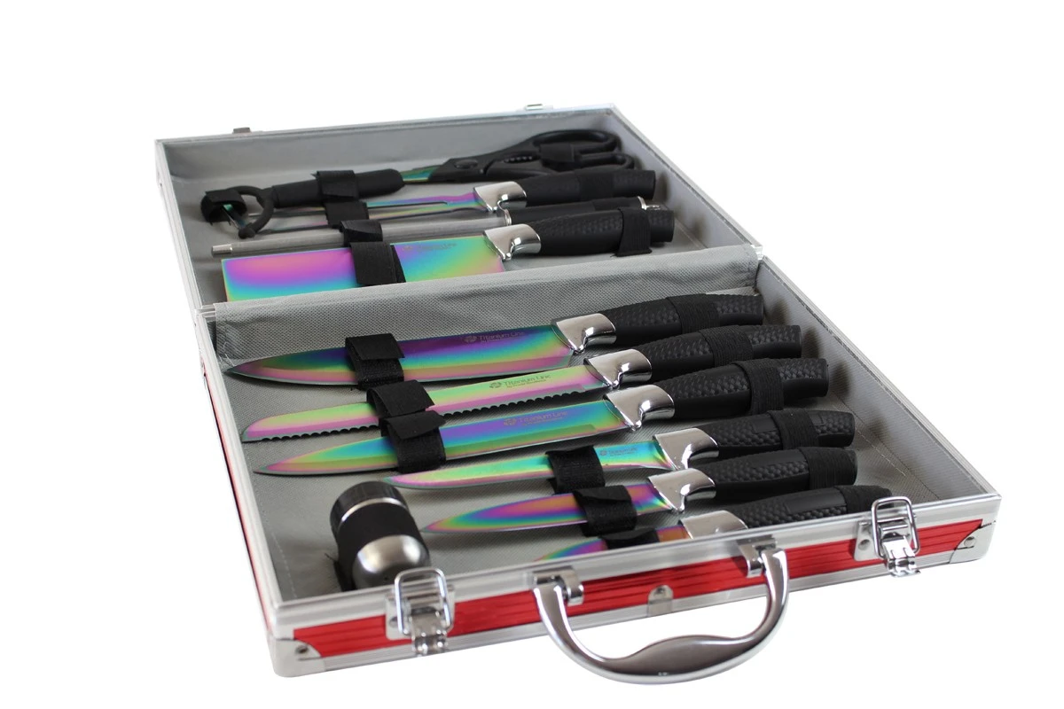 All the items included in this knife case are part of Pradel Excellence Titanium Line. They all have a titanium coating over their steel blades. This coating is responsible for the blades’ attractive appearance. However, in order to preserve their look and quality for a long time, these knives must always be washed by hand and dried immediately with soft cloth. Rust spots might appear on the blades if they are exposed to humidity for long time.