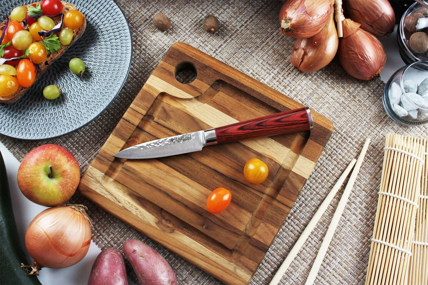 – 1 santoku knife 17cm: the Japanese-style equivalent of a chef knife; it is great for mincing, dicing, and slicing almost every type of food.