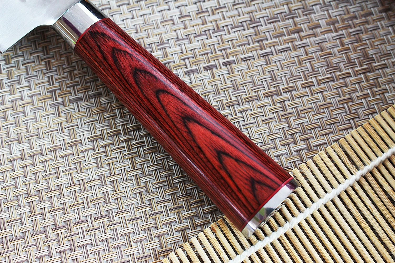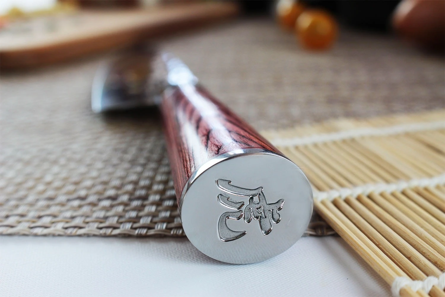 Comfortable and ergonomic, the handles are suitable for both left and right-handed cooks. The reddish, warm tones on the handle create the perfect contrast with the hammered steel of the blade. At the base (bottom) of the handle, there is an engraving of the Japanese character “Tiger.” The handles of Wusaki knives are a bit longer than the average so that you can hold them better.